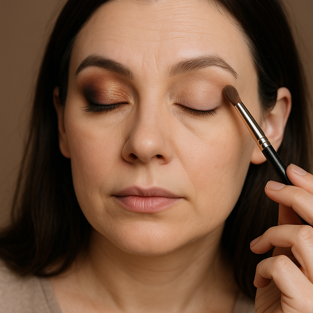 En lille smule lys skygge eller highlighter på det inderste øjenkrog og lige under brynet løfter visuelt – men undgå shimmer på selve låget, hvis det folder.